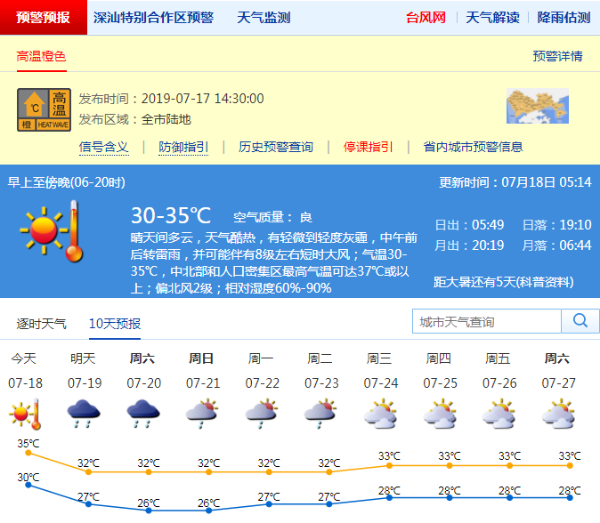 深圳新聞網(wǎng)2019年7月18日訊 受臺風(fēng)“丹娜絲”外圍下沉氣流影響,昨日我市高溫天氣加劇,全市最高39℃,出現(xiàn)在羅湖區(qū)東湖街道。市氣象臺于昨日14時(shí)30分將全市高溫黃色預(yù)警信號升級為橙色。這也是今年我市首個(gè)高溫橙色預(yù)警信號。