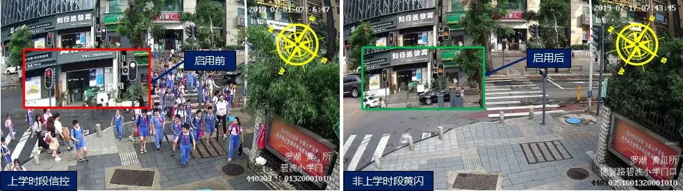 羅湖黃貝/德智路口上下學(xué)期間采取燈控設(shè)置,規(guī)范路口內(nèi)行車秩序,保證機動車與行人的安全。因暑期行人、機動車流量均明顯減少,蜀黍采取全天黃閃控制,提高機動車通行效率。