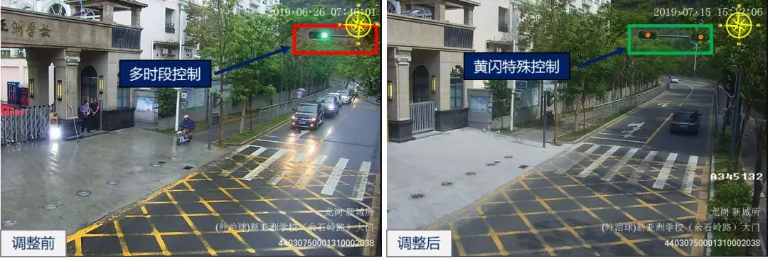 龍崗怡翠/新亞洲學校路口行人過街需求主要集中于上下學期間,近期暑期開始,行人過街需求小,路口調整至全天黃閃控制模式,以提高機動車通行效率。