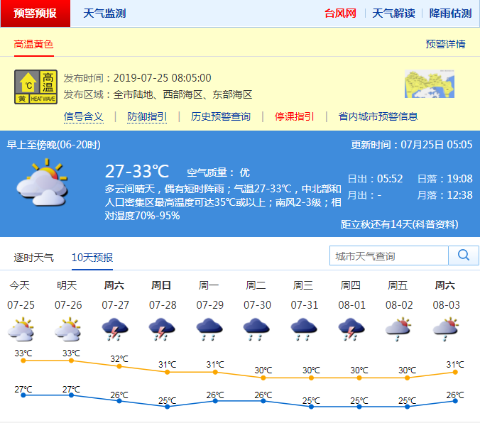 深圳新聞網(wǎng)2019年7月25日訊 市氣象局預計今日深圳多云間晴天,偶有短時陣雨;氣溫27-33℃,中北部和人口密集區(qū)最高溫度可達35℃或以上;南風2-3級;相對濕度70%-95%。26日多云,天氣炎熱;27-28日有雷陣雨,部分時間雨勢較大;29-31日多云,有雷陣雨,局部最大可達暴雨。