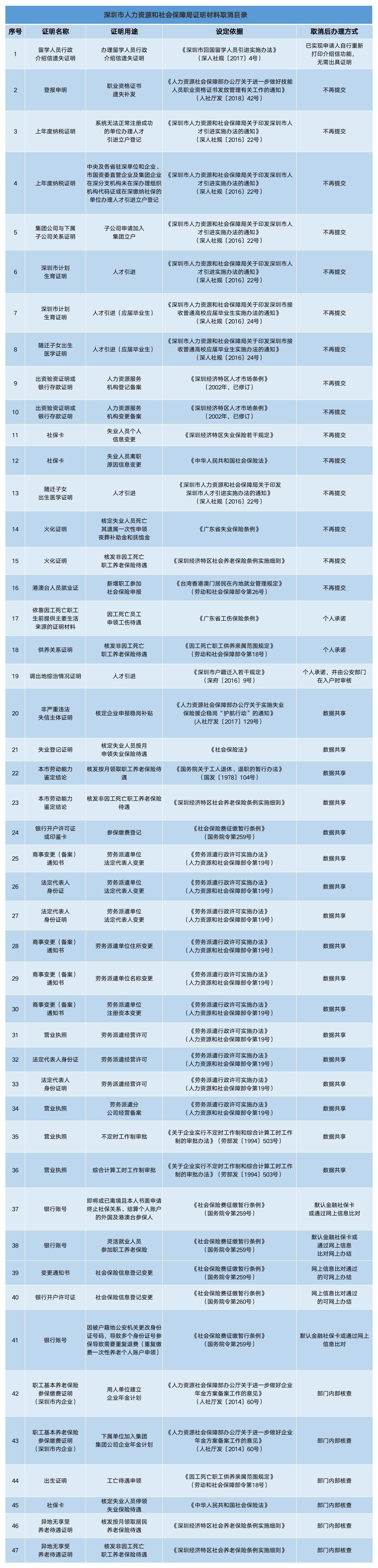 深圳新聞網(wǎng)2019年7月25日訊(見圳客戶端、深圳新聞網(wǎng)記者 施冰冰)據(jù)“深圳人社”微信公眾號消息,為了減證便民、優(yōu)化服務(wù),深圳市人力資源和社會保障局取消了47項證明材料。其中包括新增職工參加社會保險申報,港澳臺人員就業(yè)證不用再提交;人才引進(jìn)(應(yīng)屆畢業(yè)生),深圳市計劃生育證明、隨遷子女出生醫(yī)學(xué)證明無需再提交;勞務(wù)派遣單位法定代表人變更,法定代表人身份證、商事變更(備案)通知書等實現(xiàn)數(shù)據(jù)共享等等等等……