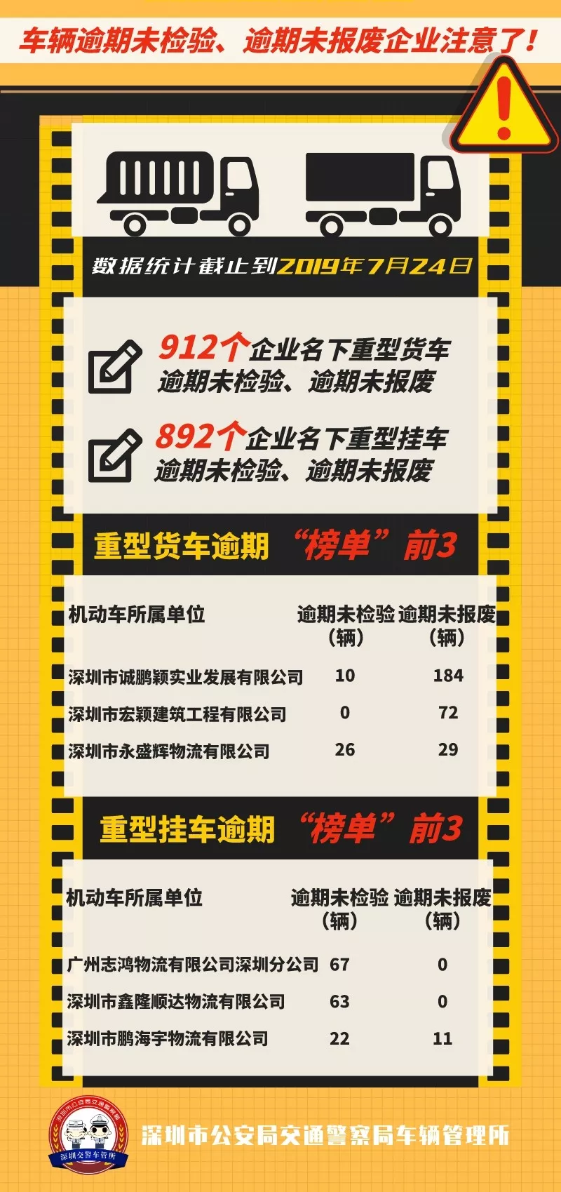 見圳客戶端·深圳新聞網(wǎng)2019年7月26日訊(見圳客戶端 深圳新聞網(wǎng)記者 何暢)車輛逾期未檢驗、逾期未報廢,存在著重大交通安全隱患,深圳部分企業(yè)不重視安全管理、名下有大量“問題車輛”未處理。7月26日“深圳交警權威發(fā)布”微信公眾號就對相關企業(yè)進行了點名曝光。