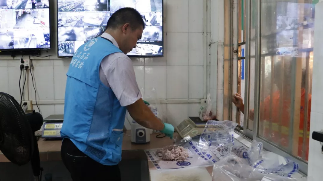 執(zhí)法人員根據(jù)市場開辦方提供的市場檔位明細(xì)表,首先隨機(jī)選取了市場內(nèi)的肉檔、水產(chǎn)品檔、菜檔,逐一進(jìn)行檢查,對(duì)檔位的營業(yè)執(zhí)照、臺(tái)賬建立情況檢查無誤后,執(zhí)法人員又隨機(jī)指定了檢查品種,由快檢人員現(xiàn)場開展快檢工作。
