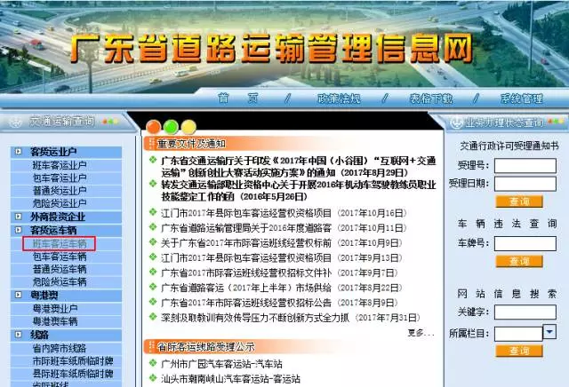 登錄廣東省道路運(yùn)輸管理信息網(wǎng),點(diǎn)擊左側(cè)菜單欄中的「客貨運(yùn)車輛」,再點(diǎn)擊「客班車客運(yùn)車輛」,就能進(jìn)入到查詢頁面。
