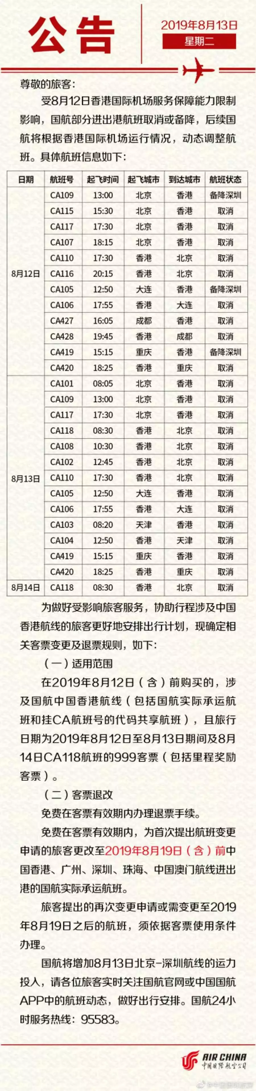 為了協(xié)助行程涉及中國香港航線的旅客更好安排出行計劃,國航也確定了相關客票變更及退票規(guī)則。