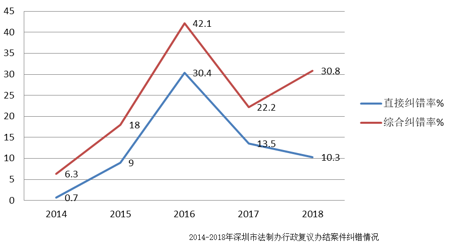 2018年深圳行政復(fù)議案件數(shù)量大幅減少,這可能與“兩隨機(jī)一公開”執(zhí)法全面推廣后執(zhí)法規(guī)范性進(jìn)一步提高和執(zhí)法爭(zhēng)議減少有關(guān)。辦結(jié)的行政復(fù)議案件中,被撤銷或確認(rèn)違法的案件比例繼續(xù)降低,但裁定終止的案件總件數(shù)雖略少于上年,比例卻有一定幅度上升??傮w而言,行政復(fù)議的直接糾錯(cuò)率有所下降,但間接糾錯(cuò)率有所上升,較好發(fā)揮了行政復(fù)議對(duì)行政執(zhí)法的監(jiān)督作用。