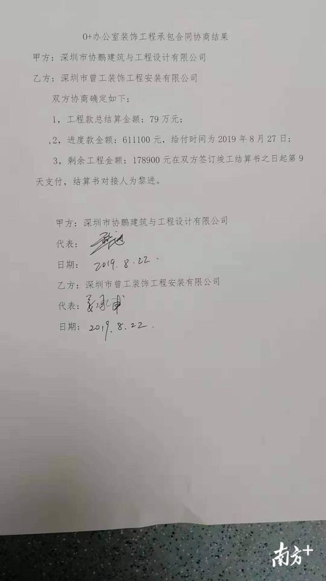 南方網(wǎng)2019年8月28日訊 去年11月,田先生承包下福田卓越城一期O+智慧平臺(tái)的室內(nèi)裝修工程。工程完工至今近半年,卻一直沒(méi)收到總包方深圳市協(xié)鵬建筑與工程設(shè)計(jì)有限公司(以下稱協(xié)鵬建筑)的余款共計(jì)84余萬(wàn)元,臨近開學(xué),工人們都急著交學(xué)費(fèi),公司也無(wú)法正常運(yùn)營(yíng)。