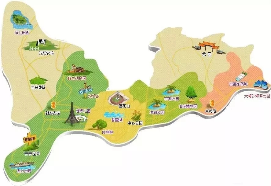 大小梅沙、大鵬片區(qū)、東部華僑城、寶安鳳凰山、仙湖植物園、紅樹林、世界之窗、蓮花山、東湖公園、福田農(nóng)批市場