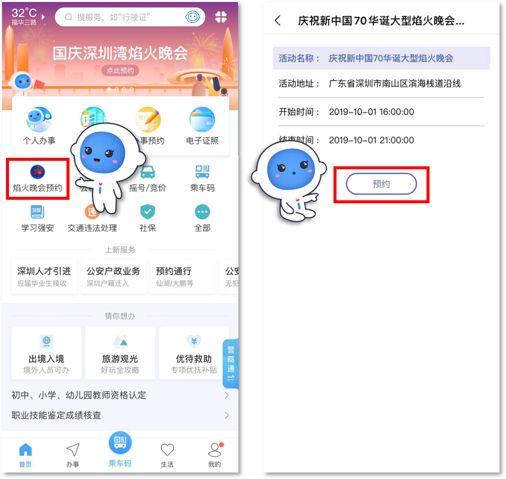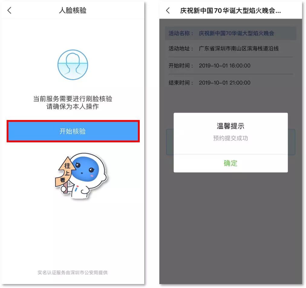 1.關(guān)注“深圳公安”微信公眾號,選擇“民生”欄,點(diǎn)擊焰火晚會預(yù)約,通過人臉認(rèn)證后即可進(jìn)入預(yù)約頁面,如下圖所示:
