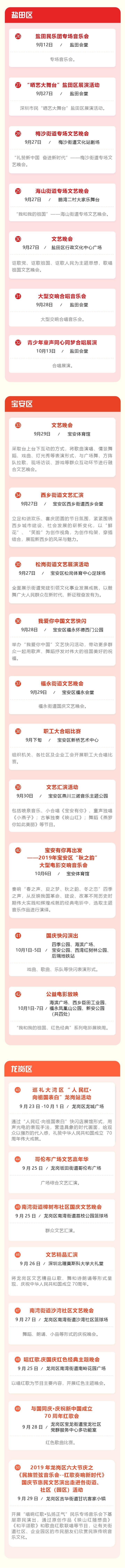 深圳特區(qū)報(bào)2019年9月26日訊 為熱烈慶祝中華人民共和國(guó)成立70周年,深圳市將舉辦規(guī)模盛大的全市性專場(chǎng)音樂(lè)會(huì)、群眾文藝晚會(huì)、焰火晚會(huì)等活動(dòng),同時(shí)將在各區(qū)舉辦80場(chǎng)“我和我的祖國(guó)”國(guó)慶群眾文藝嘉年華活動(dòng),并在全市各區(qū)舉行“愛(ài)我中華——南粵百園慶國(guó)慶”主題游園。各有關(guān)活動(dòng)安排如下: