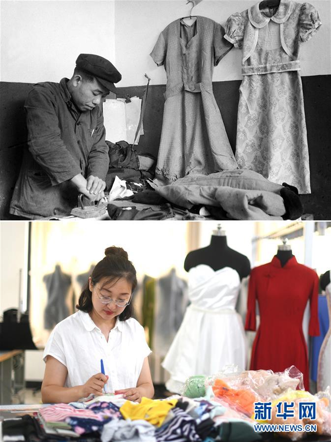 拼版照片:上圖為1957年,天津市縫紉供銷社職工在用舊大褂改制當(dāng)時女性流行的服裝——“布拉吉”(俄語“連衣裙”的音譯)(新華社記者梁一丁攝);下圖為2019年6月20日,天津工業(yè)大學(xué)針織與針織服裝系教師匡麗赟在學(xué)校教室使用服裝企業(yè)廢棄的舊面料進(jìn)行創(chuàng)作(新華社記者岳月偉攝)。