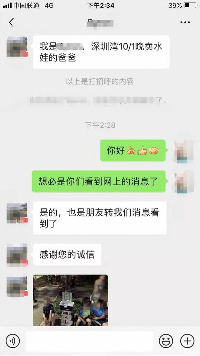 4日,剛從深圳返回青島的張先生告訴記者,中午2時35分,他的微信出現(xiàn)一個新增好友,對方說自己是深圳灣10月1日晚賣水男孩的爸爸,張先生立刻把對方加為好友。賣水男孩爸爸通過微信給張先生發(fā)來一張照片,是國慶當晚孩子在路邊賣水時拍的,讓張先生確認一下是不是照片上的孩子。“是他們,太好了,終于找到了。”張先生隨即通過微信轉(zhuǎn)賬10元錢過去,賣水男孩爸爸也收款成功。(此前報道:緊急尋人!深圳灣畔的賣水孩子,青島大叔在找你…)