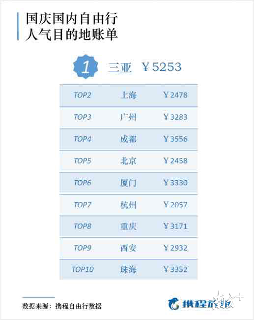 而哪些目的地在國慶期間最能吸引自由行游客?根據(jù)攜程自由行數(shù)據(jù),三亞、上海、廣州、成都、北京、廈門、杭州、重慶、西安和珠海。其中國慶前往三亞度假已經(jīng)成為潮流,單次人均花費為5253元。