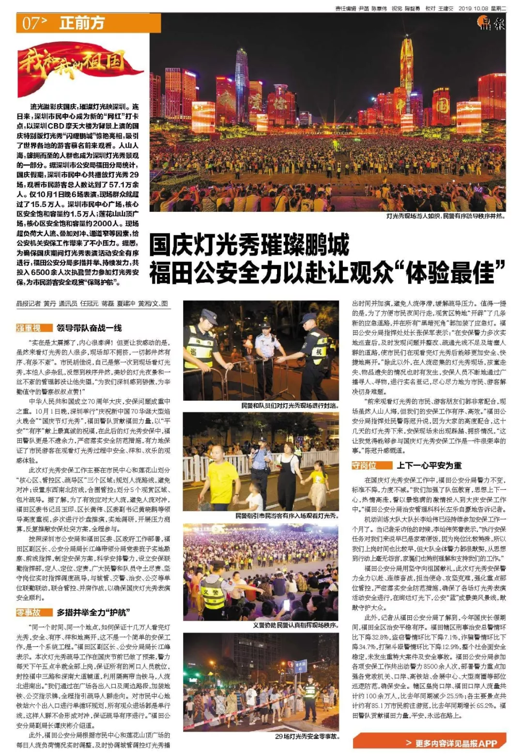 在國(guó)慶燈光秀安保工作中,福田公安分局警力不變,標(biāo)準(zhǔn)不降,力度不減。“我們加強(qiáng)了隊(duì)伍教育,思想上下一心,熱情高漲,誓以最飽滿(mǎn)的激情投入到大慶安保工作中。“福田公安分局治安管理科科長(zhǎng)左樂(lè)自豪地告訴記者。