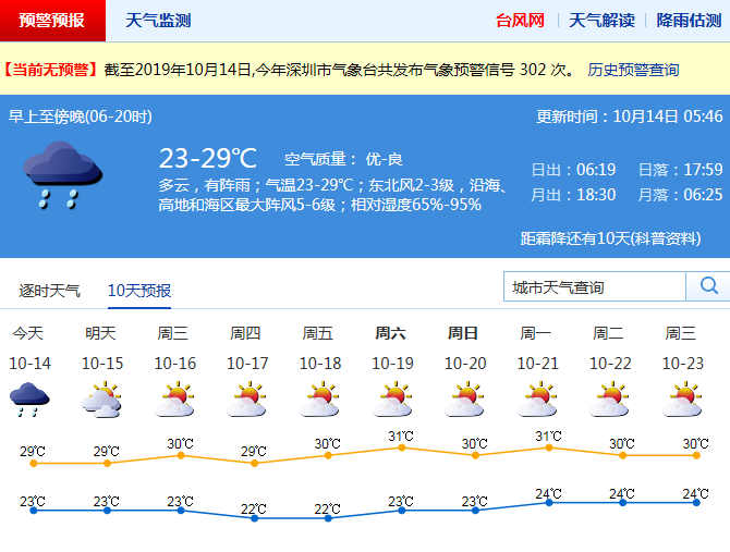 見圳客戶端·深圳新聞網(wǎng)2019年10月14日訊 受冷空氣影響,昨日凌晨至上午深圳普降大雨,局部暴雨,并伴有雷暴和7級左右短時大風(fēng)。預(yù)計(jì)本周前期風(fēng)力清勁有陣雨,中后期晴好干燥。其中,周一有陣雨,高地、沿海和海區(qū)陣風(fēng)6-7級,早晚較涼,氣溫23-29℃;周二漸轉(zhuǎn)多云,陣風(fēng)7-8級;周三至周日晴天干燥。