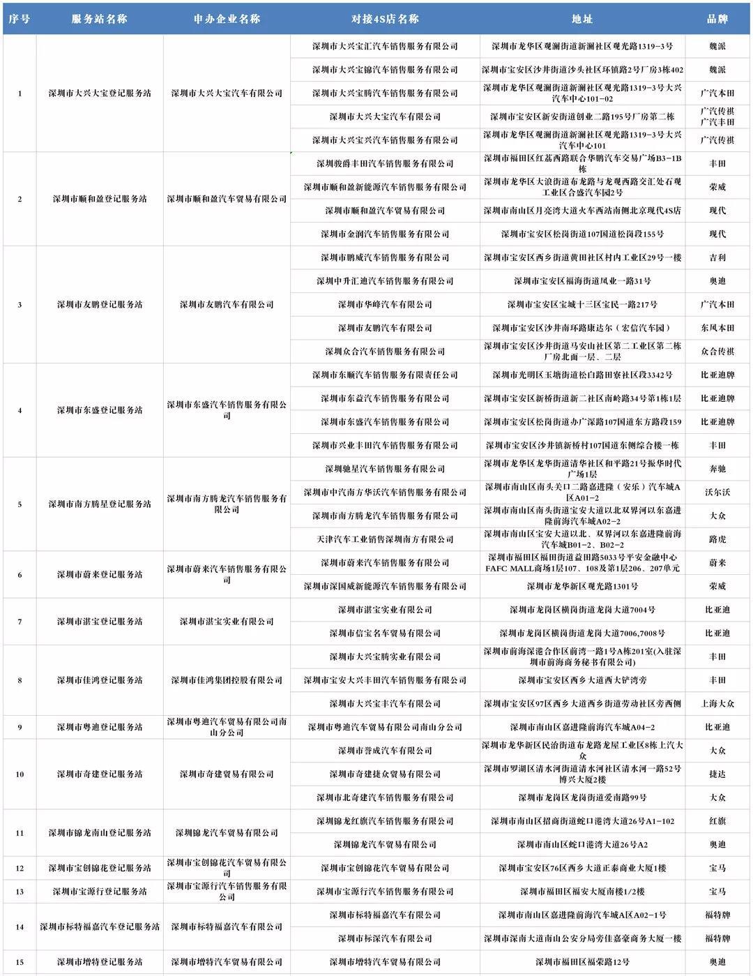 據(jù)悉,2019年9月2日,深圳市交管部門選定15家新車登記服務站、5家二手車登記服務站為第一批快捷代辦登記試點,各試點可以備案多家沒有服務站的4S店(需將資料交至車管所備案)。