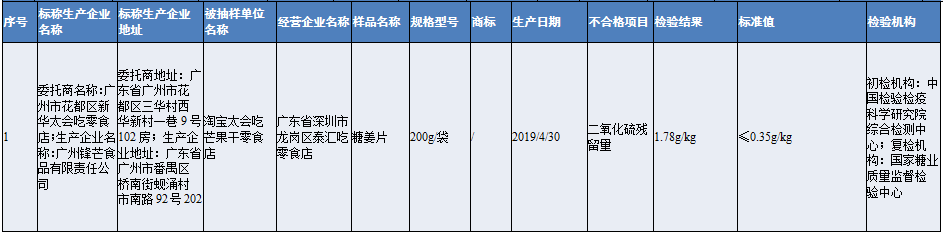 其中,深圳市龍崗區(qū)泰匯吃零食店經(jīng)營(yíng)的淘寶店銷售的糖姜片,被檢出二氧化硫殘留量不符合食品安全國(guó)家標(biāo)準(zhǔn)規(guī)定,存在食品添加劑超限量使用的問題。
