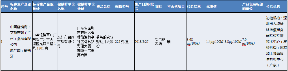 深圳市君尚百貨有限公司銷售的爺爺?shù)霓r(nóng)場(chǎng)嬰幼兒大米粉(原產(chǎn)國(guó):葡萄牙),其中碘檢出值低于產(chǎn)品包裝標(biāo)簽明示值的80%,營(yíng)養(yǎng)指標(biāo)不達(dá)標(biāo)。