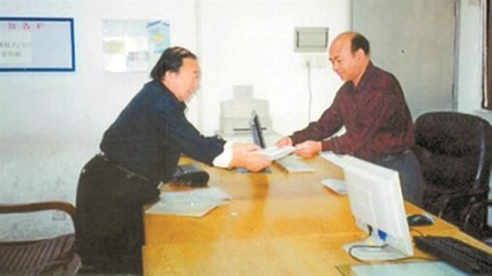 ▲1996年,吳立民(右)在市委市政府信訪辦接待來訪群眾。受訪者供圖