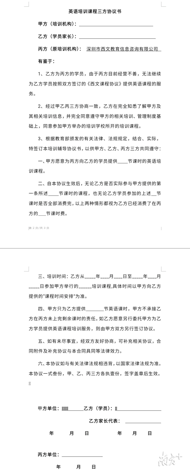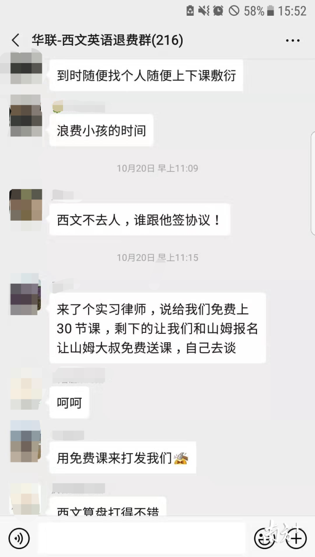 退費(fèi)群里的周女士介紹,10月20日,西文英語(yǔ)提供了一份“英語(yǔ)培訓(xùn)課程三方協(xié)議書”,但上面很多條款都沒有寫清楚。西文英語(yǔ)委托的律師稱,山姆大叔少兒英語(yǔ)愿意給西文英語(yǔ)的學(xué)員免費(fèi)提供30節(jié)課程,但學(xué)員在西文英語(yǔ)其他剩余課時(shí)的解決方案,需自行和山姆大叔協(xié)商。