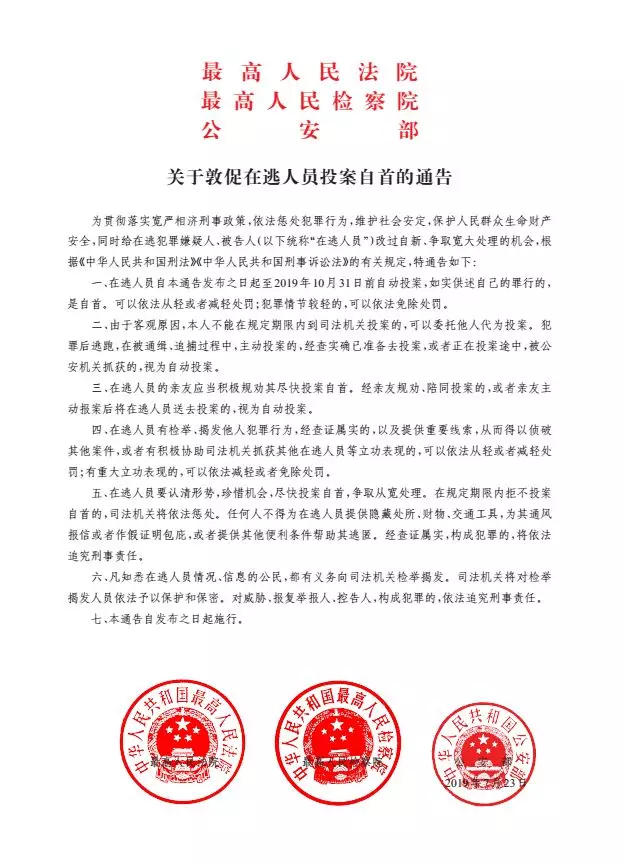 7月24日,公安部新聞發(fā)布會公布了最高人民法院、最高人民檢察院、公安部聯(lián)合印發(fā)的《關于敦促在逃人員投案自首的通告》。