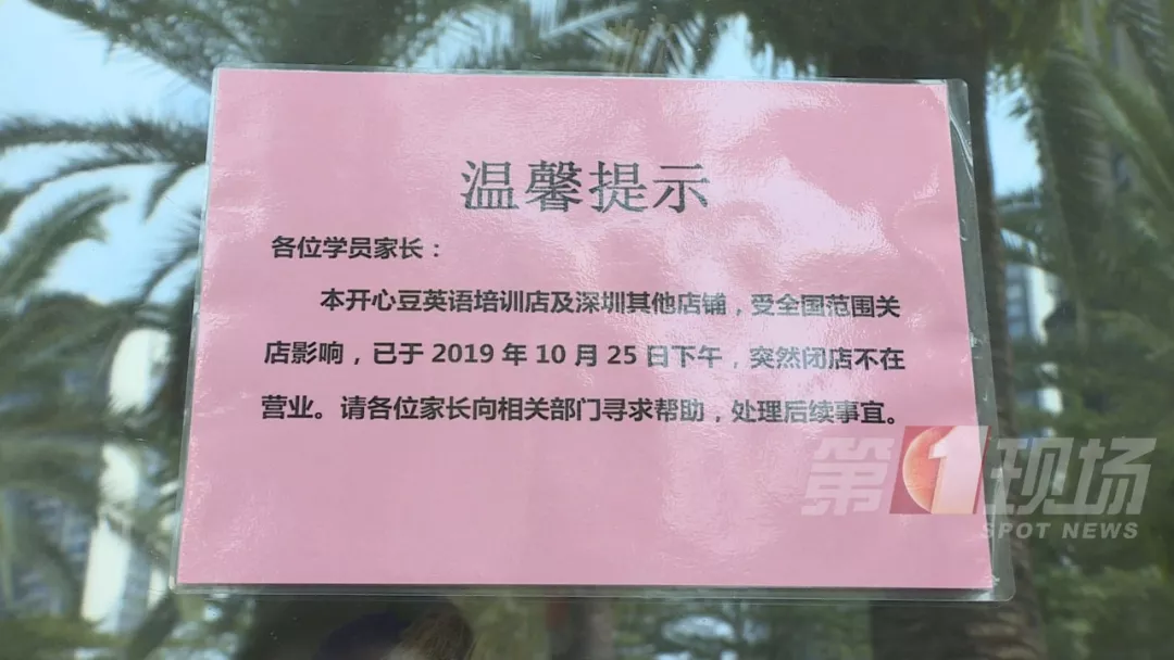 同時,家住龍崗的多名家長,今天也聚集在、鳳凰城商業(yè)中心里的一家開心豆少兒英語門前。這家店同樣是悄無聲息結(jié)業(yè)倒閉,人去樓空。商場管理方也貼出公告稱,這家店9月起就欠租,目前平湖長廊警務(wù)室已成立專門工作組。