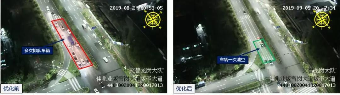 針對這一問題,深圳交警根據(jù)路口各時段、各方向的通勤需求,調整優(yōu)化了路口紅綠燈配時方案,適當增加了擁堵方向時間。優(yōu)化后,路口晚高峰西往東方向車輛排隊由300多米降至60米左右,下降80%,車輛基本實現(xiàn)1次通行。