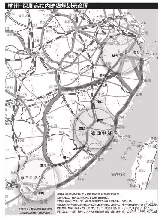 去年,參加全國兩會的部分全國人大代表提出一份《關于將杭深高鐵近海內陸線列入國家“十三五”現(xiàn)代綜合交通發(fā)展規(guī)劃修編和國家中長期鐵路網規(guī)劃的建議》。杭深高鐵近海內陸線擬自杭州西經衢州西-江山-武夷山-南平-三明-龍巖-梅州-龍川至深圳,總長約1200公里。