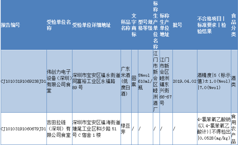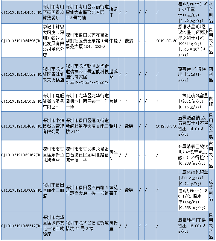 見圳客戶端 ·深圳新聞網(wǎng)2019年11月6日訊 11月5日,深圳市市場監(jiān)督管理局發(fā)布2019年第四十期食品安全抽樣檢驗(yàn)情況通報(bào),通報(bào)稱,深圳市市場監(jiān)督管理局于2019年8-9月組織對(duì)我市餐飲環(huán)節(jié)的食品開展了抽樣檢驗(yàn)工作,本次共抽檢餐飲環(huán)節(jié)食品671批次,涉及餐飲環(huán)節(jié)經(jīng)營主體584家次,共檢測食品指標(biāo)3385項(xiàng)次。其中檢出不合格樣品12批次,涉及不合格食品類別有酒類2批次均為米酒;肉制品2批次為臘肉和臘鴨腿;食糖1批次、食用農(nóng)產(chǎn)品5批次牛蛙、豬肝等在列;蔬菜制品1批次、水產(chǎn)制品1批次。