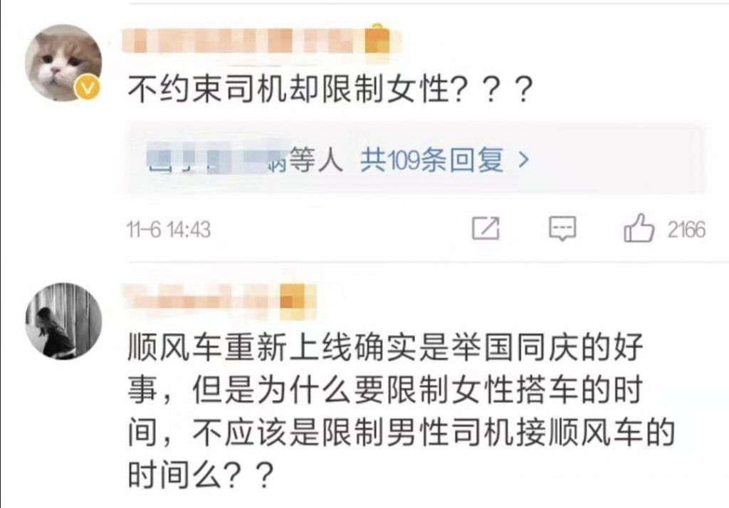 相較于其他安全措施,20:00后不接女性訂單的規(guī)定,引發(fā)的爭議尤其大。很多人覺得,這是對女性的冒犯和隱性歧視。因?yàn)橛星败囍b、怕出事后要擔(dān)責(zé),干脆讓女性無法方便地打車,屬于典型的因噎廢食。