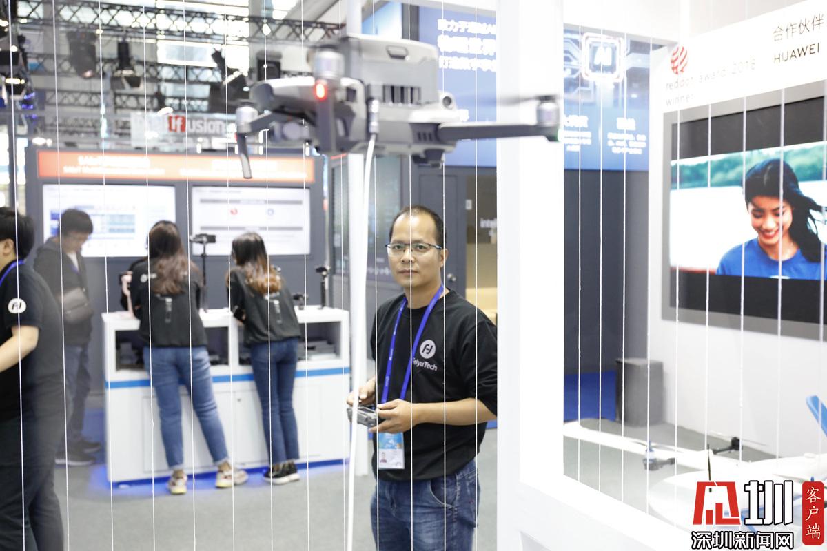 一位展區(qū)工作人員正在操控?zé)o人機(jī)。