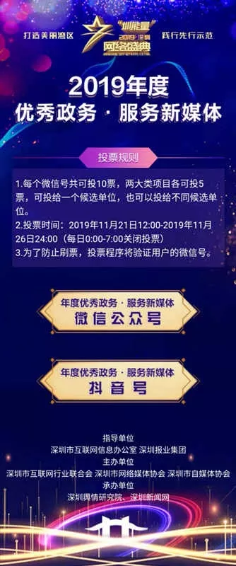 為盤點(diǎn)行業(yè)一年來取得的新探索、新成就、新經(jīng)驗(yàn),唱響主旋律,弘揚(yáng)正能量,“‘圳能量’2019深圳網(wǎng)絡(luò)盛典”——暨深圳年度優(yōu)秀政務(wù)·服務(wù)新媒體活動將于2019年12月6日隆重舉行。