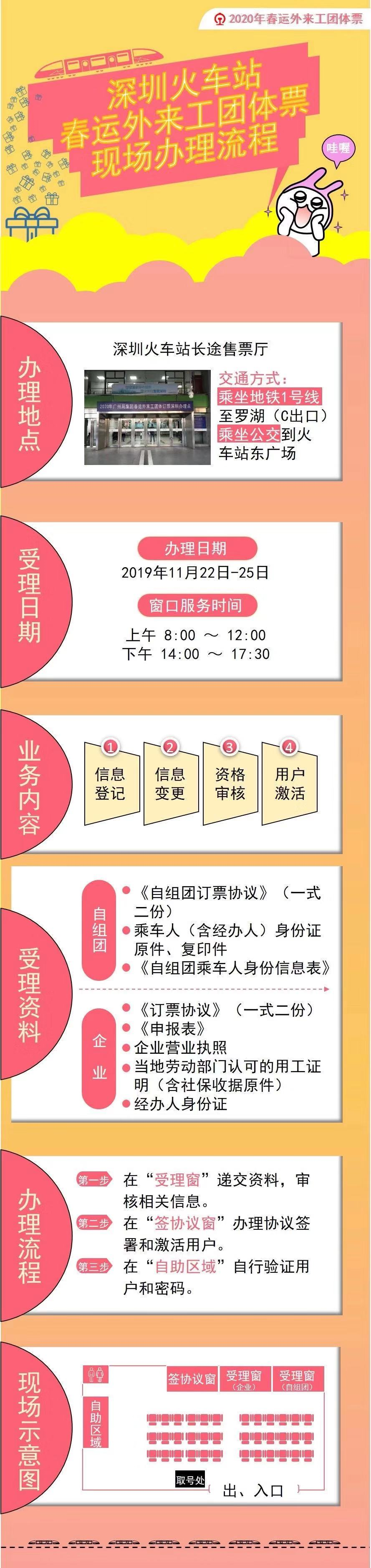 深圳特區(qū)報(bào)2019年11月22日訊 記者從深圳火車(chē)站獲悉,2019年11月22日—25日期間,訂票企業(yè)(自組團(tuán))可到深圳火車(chē)站集中辦理新企業(yè)(自組團(tuán))登記、老企業(yè)(自組團(tuán))信息變更、自組團(tuán)身份信息提交、資格審核、用戶激活等一條龍業(yè)務(wù),詳情請(qǐng)看下圖↓↓↓