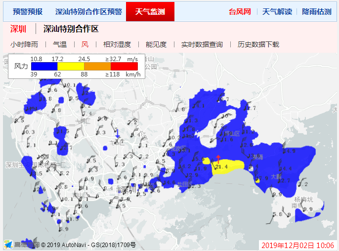 從實(shí)時的風(fēng)力圖上可以看到,龍崗區(qū)、坪山區(qū)、鹽田區(qū)、大鵬新區(qū)大部風(fēng)力在10.8m/s至17.2m/s,更有部分區(qū)域風(fēng)力達(dá)黃色預(yù)警。