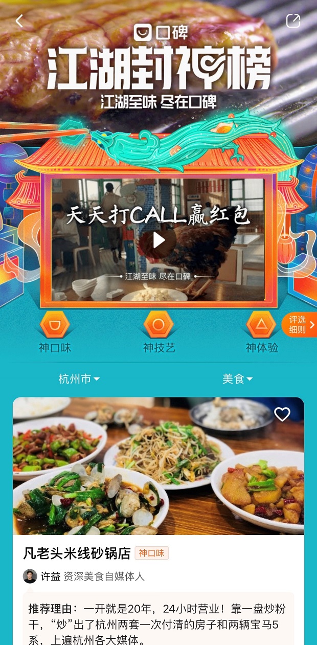見圳客戶端·深圳新聞網(wǎng)2019年12月2日訊(見圳客戶端、深圳新聞網(wǎng)記者 余俐潔 通訊員 涂雅琴)天貓“雙11”余熱未散,12月1日,口碑餓了么聯(lián)合支付寶正式開啟“1212支付寶生活節(jié)”組隊(duì)下單瓜分億元大獎,海量紅包全年特惠,口碑吃喝玩樂全場5折起、小二美食探店直播、薅羊毛……而12月2日,口碑餓了么正式發(fā)布“江湖封神榜”,已有13城的1730家店鋪入圍,這份以全新標(biāo)準(zhǔn)排名制作的美食榜單以個人喜好和數(shù)據(jù)智能為核心維度,真正實(shí)現(xiàn)了用戶與商戶精準(zhǔn)、有效、便捷的對接。深圳金戈戈、卓記米粉、天寶兄弟、高三姐豆花川菜店、嘉華小吃等86家店鋪入圍上榜。
