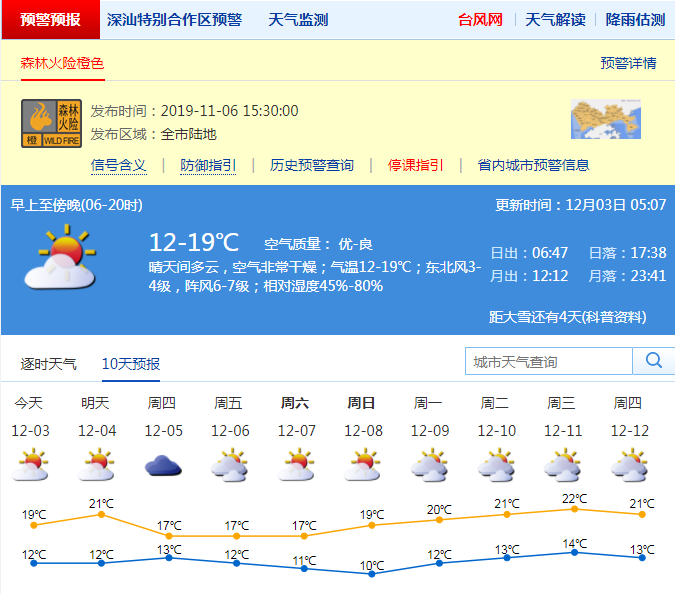 見圳客戶端·深圳新聞網(wǎng)2019年12月3日訊 近兩日,深圳風(fēng)力清勁,不少市民反饋“終于有個(gè)秋天的樣子”。記者從市氣象臺(tái)獲悉,預(yù)計(jì)3日晴天間多云,空氣非常干燥,氣溫12℃至19℃,陣風(fēng)6級至7級。4日氣溫短暫回升,氣溫12℃至21℃。5日至7日冷空氣繼續(xù)補(bǔ)充影響,風(fēng)力再次加大,氣溫進(jìn)一步下降。其中,5日氣溫13℃至17℃,6日氣溫12℃至17℃,7日氣溫11℃至17℃。
