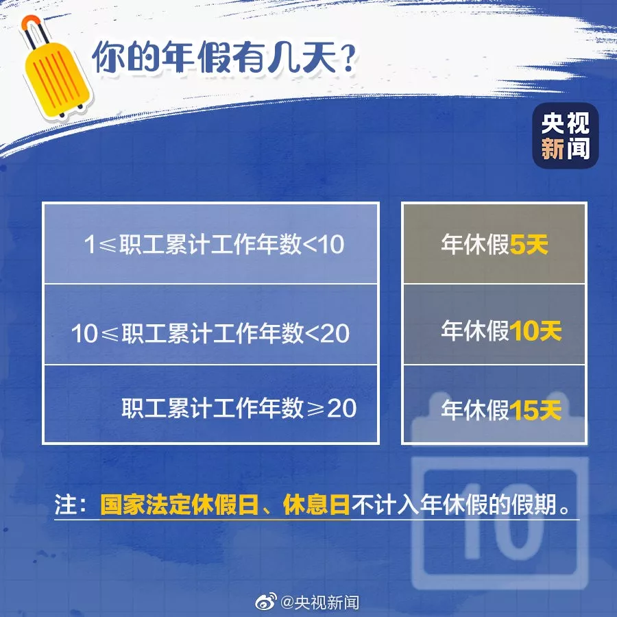 據(jù)《職工帶薪年休假條例》:職工累計工作時間已滿1年不滿10年,年休假5天;已滿10年不滿20年,年休假10天;已滿20年,年休假15天。