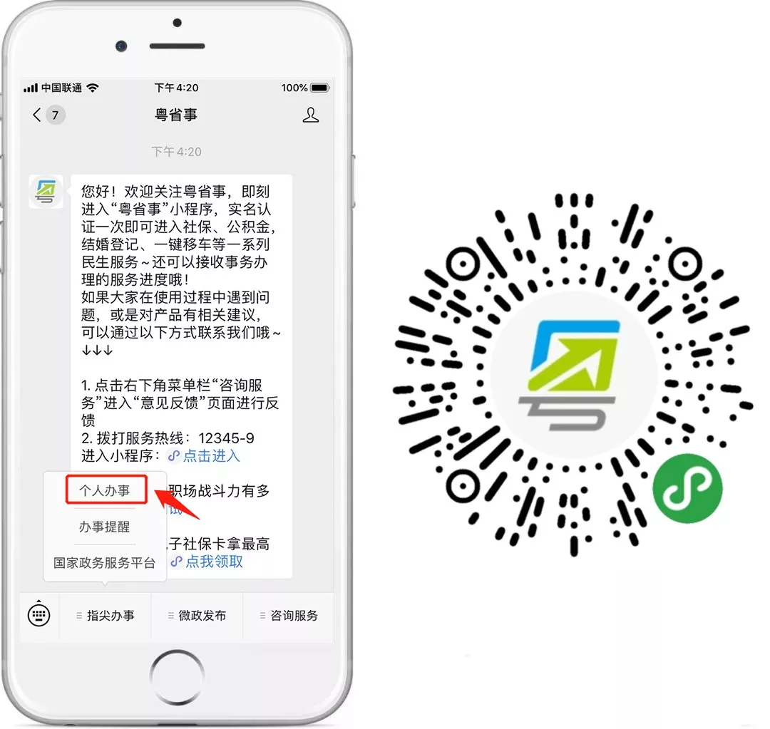 微信搜索并關注“粵省事”公眾號,點擊菜單欄“指尖辦事”—“個人辦事”進入“粵省事”小程序,或長按識別右側葵花碼進入小程序。