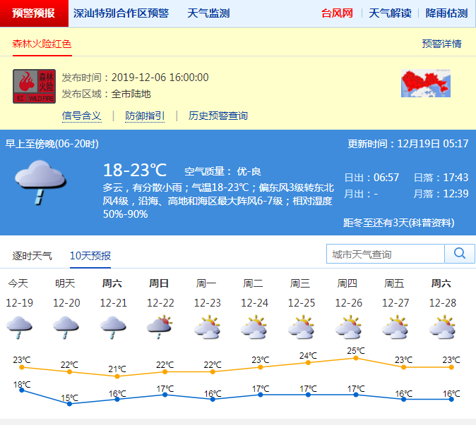 見(jiàn)圳客戶(hù)端·深圳新聞網(wǎng)2019年12月19日訊 深圳市氣象局預(yù)計(jì)18日夜間至21日冷空氣影響,轉(zhuǎn)陰天,有分散小雨,沿海、高地和海區(qū)陣風(fēng)6-7級(jí),氣溫下降,20日最低氣溫15℃;22日午后轉(zhuǎn)多云,23-25日可見(jiàn)陽(yáng)光,氣溫回升。