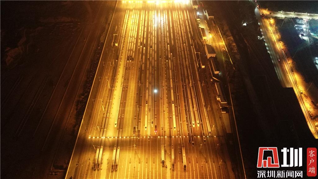 1月15日凌晨,深圳動(dòng)車運(yùn)用所內(nèi)的存車庫航拍畫面。