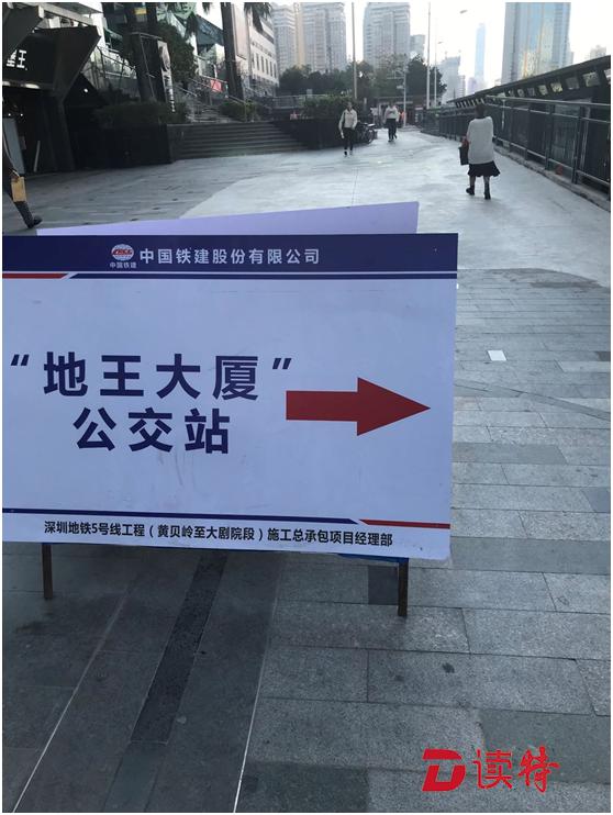 而另一處地點,從大劇院地鐵站 F出口處往羅湖書城方向,行人須繞行街邊花園步道和街邊商家通道,對于騎自行車和電動車的人尤其不便。而地王大廈公交站臺跟崗廈北地鐵站②公交站臺一樣非常狹窄,站臺左右兩邊的人行道狹窄處僅約兩米寬。在該處站臺背后,中國鐵建股份有限公司設(shè)置了一塊站名指示牌,署名單位為地鐵5號線施工總承包項目經(jīng)理部。記者詢問了一位路過的市民,市民說經(jīng)常路過此地,應(yīng)該是地鐵施工所以就占用了之前的人行道,"這里走路還好,騎車就不方便了,因為有臺階"。