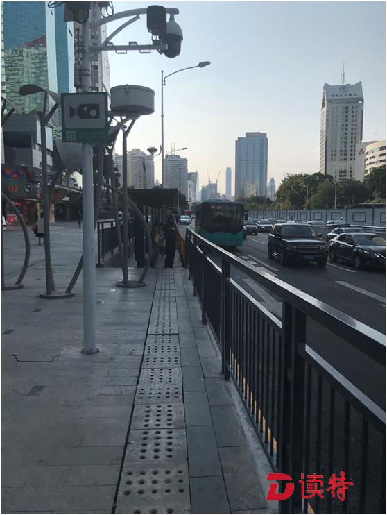 1月14日下午,記者走訪了深南大道上市民反映的兩處地點。在深南大道南側(cè)崗廈北地鐵站②公交站,記者發(fā)現(xiàn)該處的人行道和非機(jī)動車道確實非常狹窄,目測約一米多寬,而且僅靠公交站臺。站臺也很狹窄,行人、非機(jī)動車由此經(jīng)過時存安全隱患。由該站臺往東走,希爾頓飯店出入口,臨時被隔離欄劃出的人行道和非機(jī)動車道,不知何故被鐵馬阻擋,給過往的行人,尤其是騎自行車和電動車的人帶來不便。