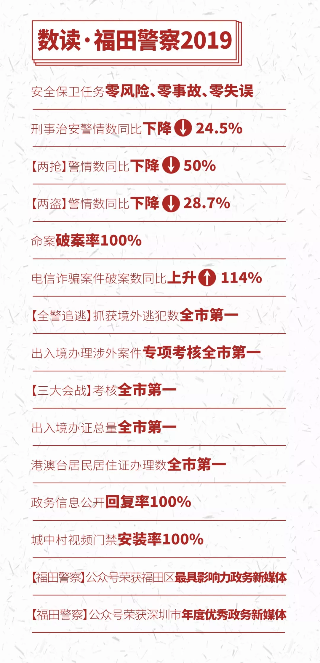 剛剛過去的2019年,是福田公安勇?lián)姑?,砥礪奮進的一年,在市局黨委和區(qū)委區(qū)政府的堅強領(lǐng)導(dǎo)下,福田公安穩(wěn)中求進、攻堅克難,穩(wěn)妥應(yīng)對化解系列重大風(fēng)險,有效護航中心城區(qū)社會政治穩(wěn)定,打贏新中國成立70周年大慶安保和澳門回歸20周年慶典安保攻堅戰(zhàn),各項重大安保活動“零風(fēng)險、零事故、零失誤”;強力推進掃黑除惡、“颶風(fēng)2019”等一系列專項行動,合成打擊效能突顯;持續(xù)推動現(xiàn)代化警務(wù)機制變革,改革攻堅蹄疾步穩(wěn);提升社會治安基礎(chǔ)治理工作,治安面貌持續(xù)向好;隊伍建設(shè)舉措剛?cè)嵯酀N煉“四個鐵一般”的過硬警隊。