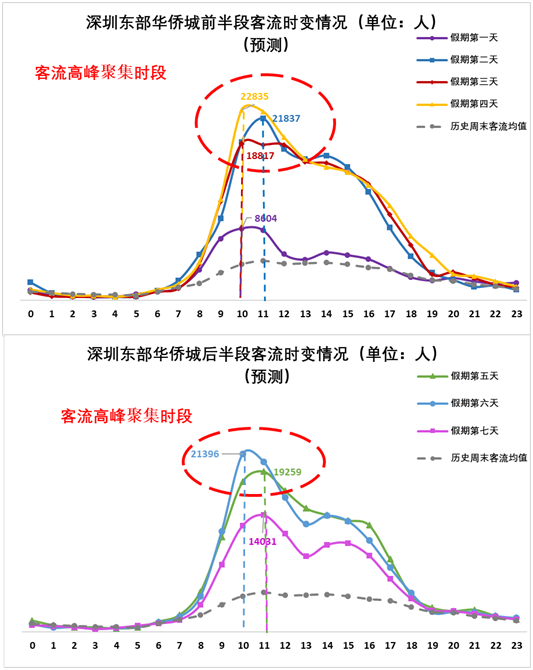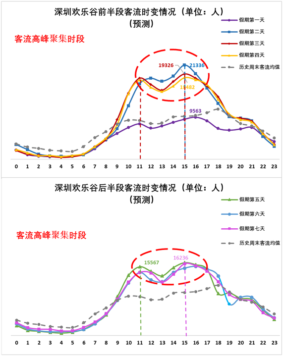 2、市內(nèi)熱門景區(qū)方面:預(yù)計(jì)1月25日至1月30日(正月初一至正月初六)深圳歡樂谷在11:00-12:00和15:00-16:00出現(xiàn)客流高峰、東部華僑城在10:00-11:00出現(xiàn)客流高峰;預(yù)計(jì)1月25日至1月27日(正月初一至正月初三),歡樂海岸在15:00前后出現(xiàn)客流高峰。