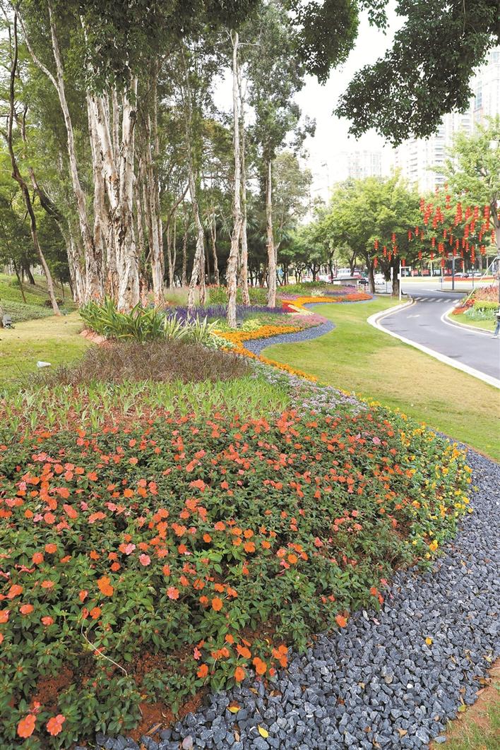走出公園,深圳街頭,一條條花景大道移步換景。深南大道中間綠化帶已完整呈現(xiàn)鳳凰飛羽圖案,以紅色的鮮花為主調(diào),花帶大氣流暢,姹紫嫣紅,是深圳打造世界著名花城的風采展示。