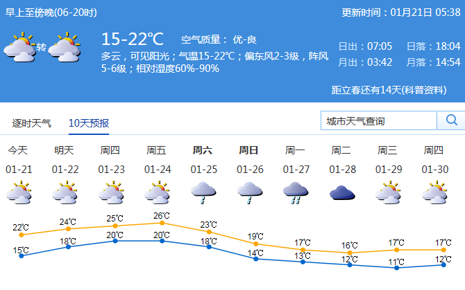 見(jiàn)圳客戶(hù)端·深圳新聞網(wǎng)2020年1月21日訊 據(jù)深圳市氣象臺(tái)消息,今日深圳多云,可見(jiàn)陽(yáng)光;氣溫15-22℃;偏東風(fēng)2-3級(jí),陣風(fēng)5-6級(jí);相對(duì)濕度60%-90%。預(yù)計(jì)早晨天氣偏涼,出門(mén)注意保暖,預(yù)防感冒。
