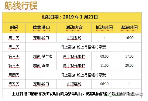 據悉,歌詩達威尼斯號郵輪1月21日16時從蛇口郵輪母港出發(fā),為6天5晚的航程,航行路線為:深圳-下龍灣(蔡蘭港)-峴港(真美)-深圳。
