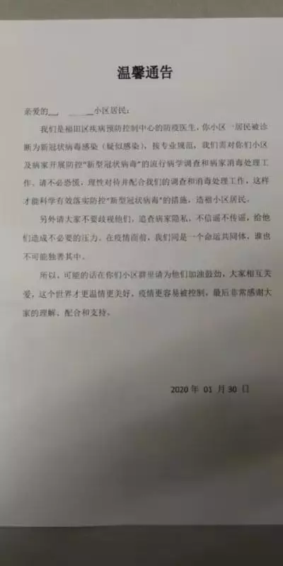 1月30日,由于深圳一小區(qū)出現(xiàn)新冠狀病毒疑似感染病例,福田區(qū)疾病預防控制中心的防疫醫(yī)生發(fā)布了這則通告。通告除了呼吁小區(qū)居民配合調查及消毒處理工作外,還特地懇請大家“不要歧視,在疫情面前,我們是同一個命運共同體,誰也不可能獨善其身。”不知為何,雖不是湖北人也未曾受過歧視,但還是被這寥寥數(shù)字的“請求”溫暖了。