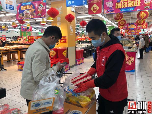 見圳客戶端·深圳新聞網(wǎng)2020年1月31日訊(見圳客戶端、深圳新聞網(wǎng)記者 胡津瑋)戴上口罩、手套,再穿上標(biāo)志性的紅色馬甲,市食藥志愿服務(wù)總隊的志愿者們紛紛走上超市的各個崗位,清理貨品、補貨、對購物車購物籃進行清潔消毒、為來購物的市民測量體溫…據(jù)了解,由于春節(jié)期間各大商超缺少人手,在市市場監(jiān)管局與團市委的指導(dǎo)下,市食藥志愿服務(wù)總隊迅速調(diào)動全市在深的食品藥品安全志愿者,成立了由近300名食品藥品安全志愿者組成的春節(jié)“菜籃子”志愿者保障工作小組,為全市各大商超提供志愿服務(wù),全力保障市場供應(yīng)、消除市民顧慮,在防控疫情特殊期間注入了紅馬甲的正能量。記者今天便走訪了深圳的一家超市,尋找這批紅色的身影,了解他們一天的工作。