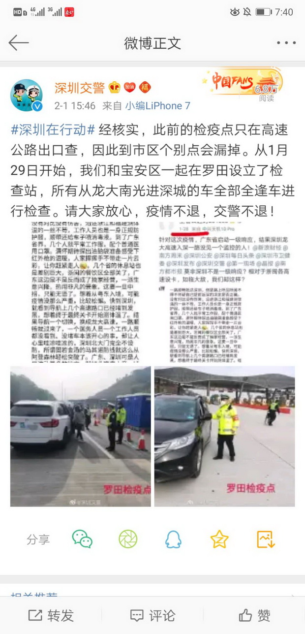 2月1日下午,深圳交警在其官方微博上表示,經(jīng)核實,此前的檢疫點只在高速公路出口查,因此到市區(qū)個別點會漏掉。從1月29日開始,深圳交警和寶安區(qū)一起在羅田設立了檢查站,所有從龍大南光進深城的車全部全逢車進行檢查。請大家放心,疫情不退,交警不退。